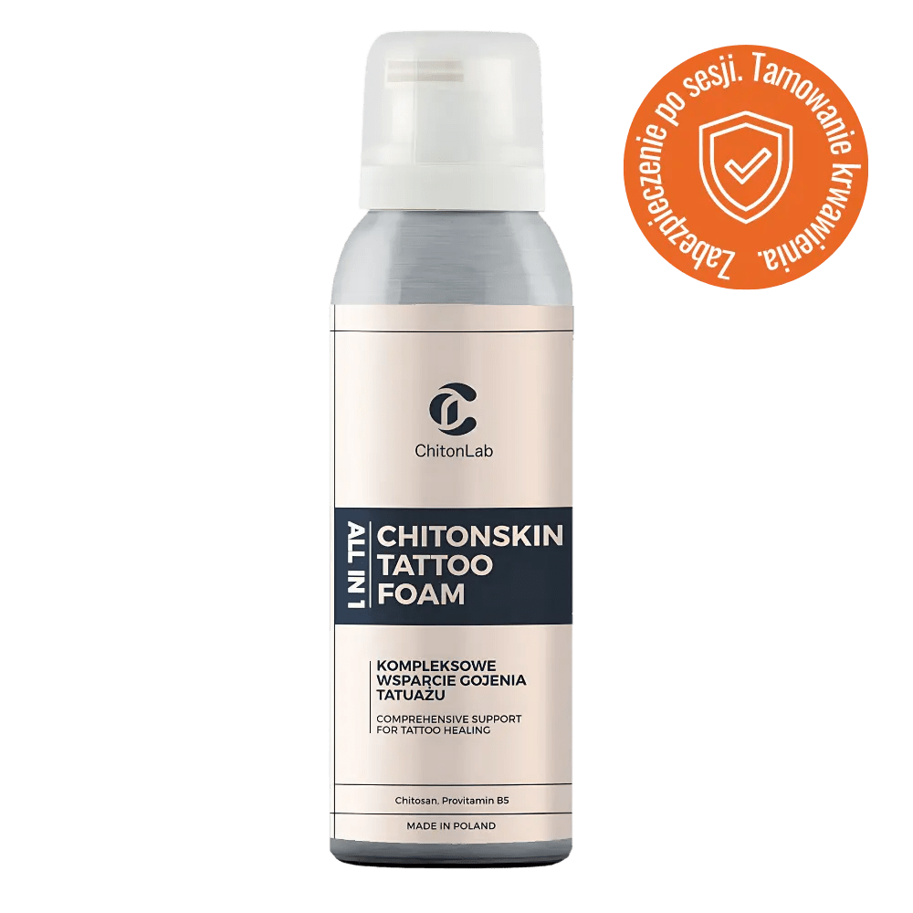 Chitonskin tworzy na skórze oddychającą powłokę ochronno regeneracyjną. Dzięki opatentowanej w Polsce technologii ChitoVelum chroni tatuaż przed czynnikami zewnętrznymi i uszkodzeniami mechanicznymi, utrzymuje nawilżenie skóry oraz wspiera proces gojenia. Bezpieczny dla każdego typu skóry, może być stosowany jako opatrunek po sesji oraz przez cały proces gojenia.